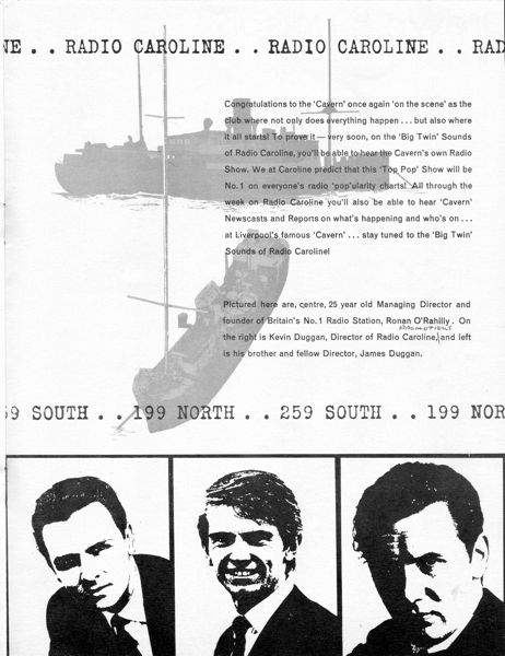 George Hare worked as Caroline North's on-shore agent. Perhaps as far as the DJs were concerned, his most important function was to make sure that they got paid, but the payroll was just a small part of his job and he often arranged functions and promotions for the station. Both George and Caroline were involved in the July 1966 relaunch of Liverpool's Cavern Club. In fact, Caroline was so much involved that all the promotional material for the club bore a Cavern logo in the shape of the Caroline bell. A massive publicity campaign was planned with regular Cavern programming, including a 30-minute Saturday morning show. Somewhat ironically, the club was re-opened by PM Harold Wilson – not offshore radio's biggest supporter! Who knows if the PM would have agreed to perform the ceremony had he appreciated that Caroline was involved? George, who as you can see has excellent taste in teeshirts, has very kindly