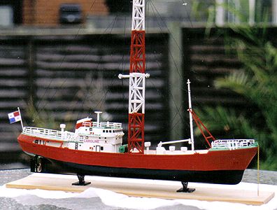 MIKE SAYS: I was interested to see the model of the Ross Revenge on your great web-site and thought you might like to see the one that I have constructed using the very same model. I hope that you like it, as you can see a lot of work has gone into getting it as near accurate as possible. The main pictures, as you can see, are of one ship in almost finished condition. I have, in fact, made two and they are both now finished and look great if I do say so myself. (See photo below) The first one I am going to keep, the second I intend to put on e-bay. I spent a lot of time on the Ross and did quite a few broadcasts from the ship i.e., several RSLs and also probably the last time she broadcast illegally from inside British waters. They were great days and I miss the ship and all those involved at the time greatly. My health stops me going to stay on the ship now but making the models has brought back a lot of great memories, looking at photos of the Ross, etc, to help in making the models. Keep up the good work with your site it's well worth it LA and kindest regards,Mike Stewart |