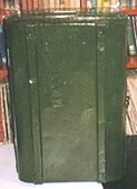 The guy I made the model for had a problem with where to store it and how to illuminate it. Being only a 1/47 scale model and in plastic, the model was too small for Fredericia-type wheat bulbs, with a threat of possible fire/melt danger. "San Tan Greenore", here in the Welsh Republic has many ships' chandlers. At one, I found a genuine sailor's metal kit trunk, in a bad state. (above, right). This was purchased, sanded and coated with anti-rust engine block paint as used on Morris Minors. On it, I put a backdrop, (below, left) with Shivering Sands forts and the DTI vessel Dioptric Surveyor on the horizon. Cotton wool clouds followed by cotton wool sea were then installed and painted to suit. |