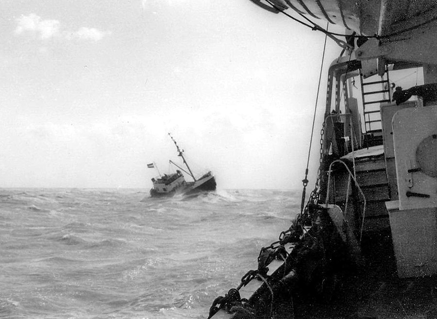Offshore 1 heads for the ship in stormy conditions. |