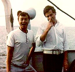 Hans Knot has very kindly forwarded this photograph of 'Admiral' Robbie Dale, taken in Lanzarote, where he now runs a camping and holiday park with his wife Stella. See more recent pics of Robbie at the 2002 Offshore Reunion and at the Caroline 40th Birthday Party See Keefers' fantastic pic of Robbie and other DJs in the galley of the Mi Amigo, (below) and Steve Young's pic at the bottom of the previous page. |
