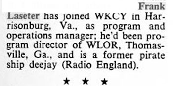 A 1968 clipping from Billboard, concerning Frank's later career in the States, where he reverted to using his real name.During his final Radio London programme, on August 14th 1967, Chuck Blair dedicated a Four Seasons track to, "The old Radio England gang, Phil Martin, Bill Berry, Alan Black, Boom Boom Brannigan, Ron O'Quinn, Larry Dean, Jerry Smithwick and all the boys."