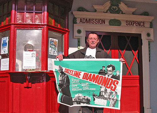 On Saturday and Sunday, Harwich's beautifully refurbished 1911 cinema, the Electric Palace, will show films from the Sixties. These will be premieres at the cinema, as the movies were all released prior to the building's restoration. £1 from every ticket sold will be donated to the LV18 Restoration Fund. The cinema's website has the full schedule, which includes the Radio London film, Dateline Diamonds. This is extremely appropriate, as the film concludes with a car chase that finishes in Harwich. Read our special two-part feature about the film here. Electric Palace schedule of films and live events Right: Our friend Ray Reynolds stands outside the Electric Palace with a poster for the Radio London film that he discovered in an antiques shop. |