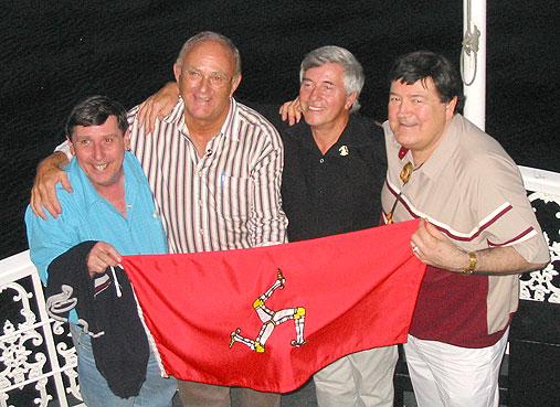 Links: Audio recorded by Mick (and Granny!) specially for the 2001 Big L broadcast. (© Radio London Ltd) Kenny Tosh has posted an excerpt from the video he shot during the Vancouver reunion on Youtube The Pirate Radio Hall of Fame tribute Webby's confession regarding his wedding report gaff. The Pirate Radio Hall of Fame has more photos of Mick and Janet's offshore wedding and a copy of the Order of Service. IOM Today reports on Mick's visit. (Right) Flying the Manx flag on a boat trip during the Vancouver Reunion: Jim Murphy's biography of Mick on his original website, now hosted by Radio London. In this documentary, (at 09:29) Mick lip-syncs to his single 'Long Time Between Lovers'. Photos of the 35th Anniversary Reunion, 2002. |