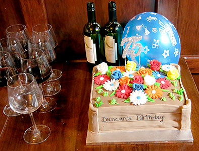Duncan with Galaxy pals Dave 'Hermione' Hawkins, Ian 'Wombat' Damon and Mich. (Right) The birthday cake illustrates how the flowerbed will look after Duncan's used the watering can and a few seeds. (Photos: Chris Payne) More photos on the Pirate Radio hall of Fame |