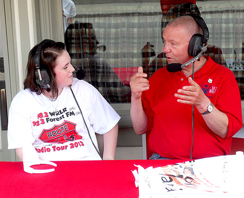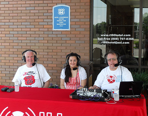 | The Mother Road Tour Paul Peters and Geoff Kemp who co-host the Fabulous Fifties Radio Show on Forest FM, linked with WRLR of Illinois and got their kicks on Route 66. Paul writes: "Our Route 66 radio tour was fantastic! Here is the link to an article about us in the Radio World Magazine in the U.S. Also, Dave Cash called us to ask if we'd be guests on his Saturday BBC across-the-south show. Poor Dave, he could not get a word in!" Photos courtesy of Paul and Geoff Below, left: Paul talks to a young lady from the Palms Grill, Atlanta, the last major stop; right, Geoff, WRLR Morning Drive host, Paul Lepek (right) and guest |