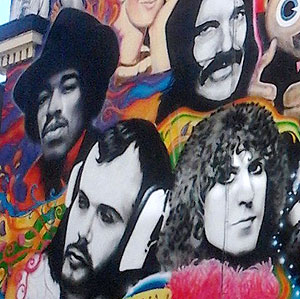 Peel's Wall of Fame – Brighton's Full of Fab Forty Artists! Left, detail of the mural: John Peel is flanked by Jimi Hendrix and Marc Bolan, two of his favourite Fab Forty artists. |