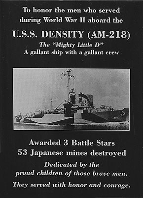 USS Density bell could do with a polish! "We recently visited the Fredericksburg museum to Right: The plaque dedicated to the 'Mighty Little D' and her crew members by their families Full story of the discovery of the bell, its presentation to the shipmates by Ron Buninga and subsequently, to the Museum of the Pacific War.