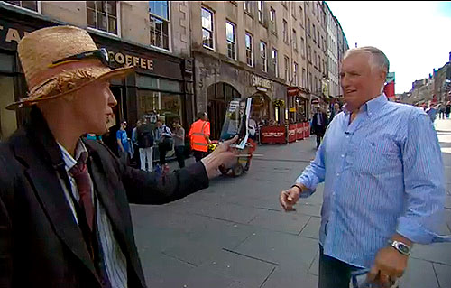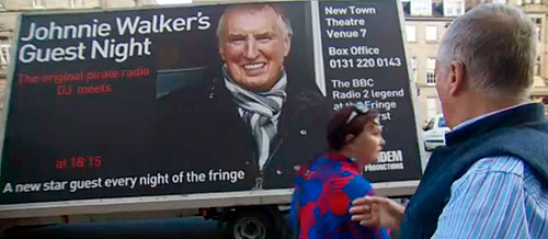 Johnnie at the Edinburgh Fringe Above, right: The show is promoted via a huge hoarding on a lorry Below, right: a fan compares a photo on a flyer to the real thing to check that he's actually talking to JW |