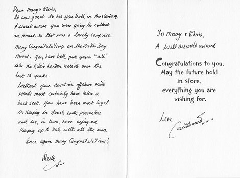 I am honoured and delighted to be a recipient of one of the final Radio Day Awards, which is also an accolade to Chris and to everyone who has kindly contributed to the Radio London website over the years. On Friday 28th March, we celebrated not only the 50th anniversary of the start of offshore radio, but the website's 15th birthday, on March 29th. Thanks to everyone who has visited the website over the years.