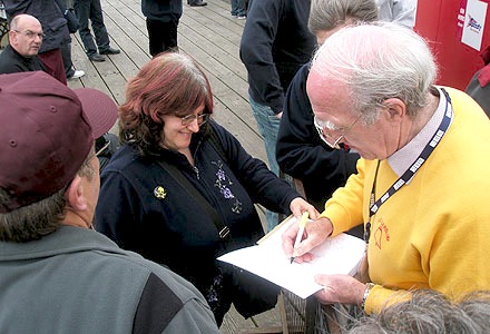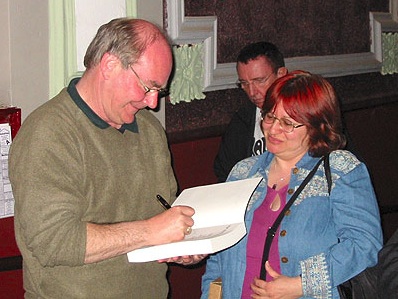 (Right) Ray Clark autographs Cari's copy of 'Pop Went the Pirates' at the Electric Palace theatre, Harwich