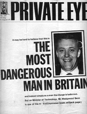 Tony Benn, depicted on the August 4th 1967 cover of Private Eye as 'The Most Dangerous Man in Britain' |