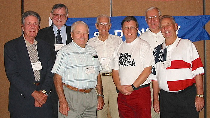 | The two recently-departed USS Density shipmates, Charlie Stock and Verne Bailey at the 2001 Dallas Reunion. Back row: Bill Brandstetter, Ben Toney, Tom Danaher, Russell Dupuis. Front: Charlie Stock, Chris Payne, Verne Bailey. |