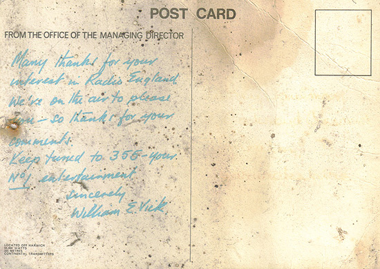 This is a tatty postcard that's been languishing in my old shed at my parents' house, since 1968. The shed was my 1967 Christmas present (what an anorak, eh!) and I got the card after sending a signal report to the station. What puzzles me now, thinking back, was did I get the card in 1967, before most of the stations went off the air, or did Radio England/Britain Radio carry on afterwards?