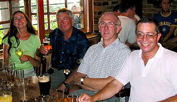 | Each summer, Roger and Fran Cooper, and Colin and Jacky Pattenden hold a picnic for anyone who wants to go. You can bring anyone you like they don't have to be known to the others. It's a great idea, and this year's saw us at Runnymede near Windsor, on a very hot August afternoon. (You can also see the organisers participating in the 2001 RSL, here.) You'll be wondering about the pig... It shows the location of the picnic for arriving participants! (Read more about the picnic on Roger and Fran's website, here.) | |