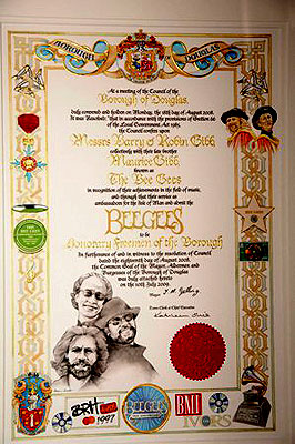 'Children of the World' made Freemen of Douglas (left) The Mayor of Douglas Councillor Michael Gelling presents Robin and Barry Gibb with their Freemen certificate. (right) The vellum designed and created in calligraphy by Colleen Corlett Ceremony photographs © 2009 Douglas Borough Council |