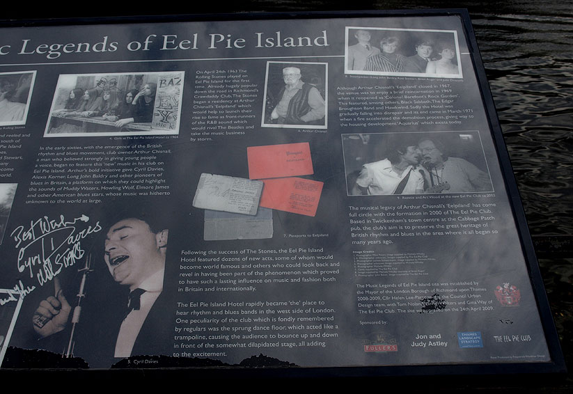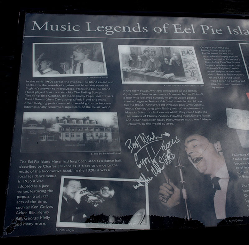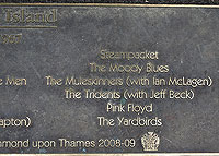 | A plaque unveiled on the riverbank at Twickenham commemorates the music legends who played the famous club on Eel Pie Island. Local lads the Rolling Stones became stars there before hitting the big time, alongside the likes of David Bowie and the Who. It's nice to note that several of our Knees Club members played the renowned club and have been honoured as legends. The plaque is sited opposite the Thames island location where the Eel Pie hotel unfortunately burnt down in 1971. Although accessible by footbridge, the island is privately owned and not open to the public. A contemporary version of the Eel Pie Club, which aims to keep alive the spirit and sounds of the original, currently meets at Richmond's Cabbage Patch pub. Click on the small photos above and below, to view legible versions. |