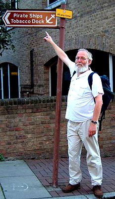 as young lads. Probably lost in the mists of time... Left, Hans poses with an appropriate sign at St Katharine's dock, London. Photo: Martin van der Ven |