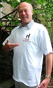 Tee Time! We decided it was high time that Radio 270's Guy Hamilton had a replacement for the Big L teeshirt which he's shown wearing while aboard the Oceaan 7 (left). That was in 1967, so thirty-eight years later, Radio London presented Guy with a lovely new 'Fab at 40' tee. As you can see, he hasn't changed a bit and looks very fetching in his fab gear! You can get yours here! |