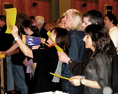 | Spot the Superstar singer! Yes, you're right, there are TWO here John Otway and Mary Payne. | 'Metal Richard' briefs newly-arrived vocalists on 'heavy singing' techniques | A fan is tested