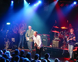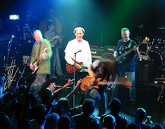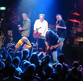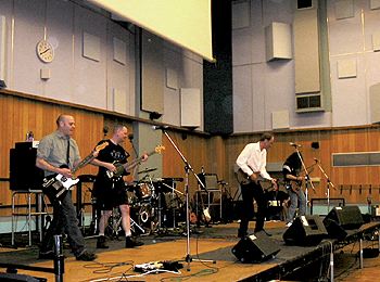 At the door to Studio One, we were greeted by Patsy Andrews, one of the very hard-working organisers, and we all signed-in on a huge card, to prove that we had really been a part of Otway's choir. Inside, T-shirts were already available with all 900 choir-member names printed on them.When everyone was present, Otway and the band performed a couple of 'warm-up' numbers and then we rehearsed for our big moment. At first, the 'choir' wasn't quite managing to heckle together, but after a bit of practise, we improved. (That's my story, anyway.) We even got to 'sing' (a term used very loosely here ) a couple of lines and a chorus at the end of the song, with Otway heckling us! |