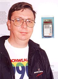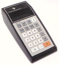 Chris's exhibition display text: In 1972, I was working for a company, Lion Systems Developments in Gerrards Cross, Bucks, as an electronic design engineer. One day, the rep from Texas Instruments visited us. Just as he was about to go, he said, "Oh, have a look at this." He produced a small beige and brown plastic box, with some little square buttons on the top. As well as number keys, there was a plus sign! Well, the fun we had adding 12 and 4, and getting the answer '16' on the little display of LEDs (light-emitting diodes)... The four-function calculator ran on batteries and you could put it in your pocket. What a revelation, not to mention expense! The rep told us that it was still secret, but he felt we could be trusted to keep it quiet. This prototype was to become the TI-2500 "Datamath" calculator. |