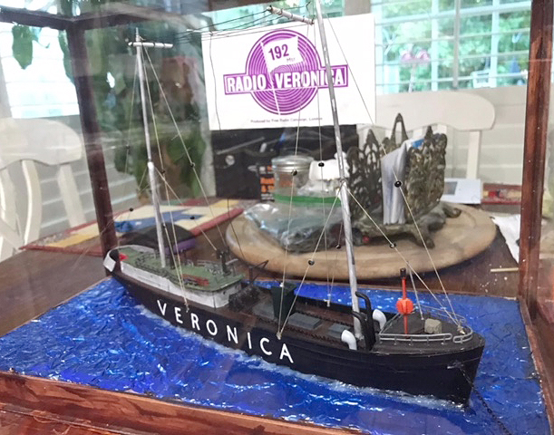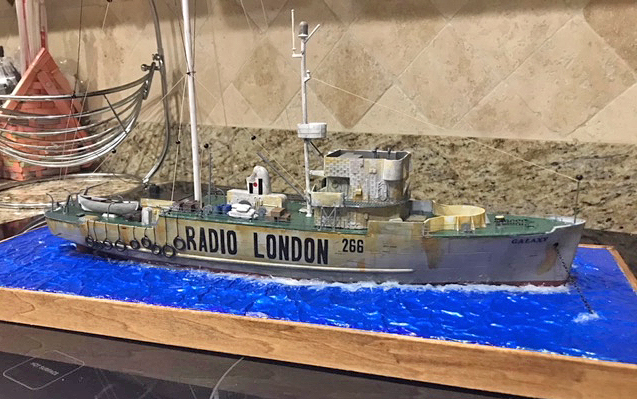My name is John Pate and I reside in Sugar Land, Tx, just outside of Houston. I have been making models since around the age of 6. I never really mastered it, but is a enjoyable pastime. I have always been a radio geek. It started with me listening to weird noises on a old tube/valve Airmaster radio and then I played around with a better antenna to get improved reception. All this led to me getting a ham radio license back in 1974. I worked as a engineer/board operator at WGAC 580 kHz, a small AM station. This was many years before the age of the internet, so pirate radio was stations on just below the 40 meter band (7 MHz). I enjoyed listening to those and also to the spy number stations. Ah, the enjoyable days of the Cold War propaganda – the BBC, Radio Moscow, VOA, RCI, and many others! Next came career, family, those things that make you set aside your hobbies for other responsibilities. I still listened to shortwave off and on and built a model here and there. Fast forward to the early 2000s, when the internet introduced me to many new radio concepts. While fiddling around, I came across the subject of pirate/offshore radio. I researched it more and became fascinated by this time in radio history. Being in the US, I have to get most of the books, old souvenirs, etc from the UK. Then I found YouTube and discovered show clips from the various ships. I have a thing for jingles, so the Radio London PAMS jingles really stood out and ran through my head! Over time I saw a Facebook group dedicated to Pirate Radio ships, so I thought, "Hey, I can probably do that." I gave making models of the ships a shot and now I'm hooked! My first try was, of course, Radio London. I saw several photos on the Radio London website and converted the old Lindberg minesweeper kit into the MV Galaxy. I used various sizes and shapes of Evergreen styrene and K&S metal tubing to modify the kit into something that represented MV Galaxy. I cut the 'Radio London 266' logo on my Cricut machine, but it took a long time to find a font that matched. I also built a case for the ship so no dust can attack the radio antenna rigging that I painstakingly tried to recreate. I used small black glass beads as insulators. The model was airbrushed using acrylics and weathered with various acrylic washes.