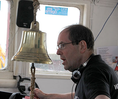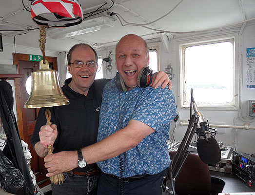 A brief email like this is in reality an inadequate way of expressing the huge gratitude that I and the Pharos Trust have for your efforts. Many of you - at your own very considerable expense - travelled long distances to be with us and stay in Harwich. Such generosity is touching and does not go unnoticed. The broadcast was a team effort, and I was delighted by the teamwork that was on display. Seasoned broadcasters and beginners alike pulled together, helping each other to make it nine days for Harwich to remember. Great music, great reminiscences, great fun. Great radio. Our programmes were unique - a diverse range of styles and music that, perhaps surprisingly in this compartmentalised day and age, resonated with all our audiences and not just a niche. We have received many emails, Facebook messages and calls expressing delight at what we did and there are lots of listeners out there who are now sad that they will have to wait a year to hear their favourites back on air. Your efforts were - to quote the title of the very last record we played, chosen with extraordinary perception by the youngest member of our team - "not in vain". The LV18 is now safe for another year, with sufficient money in the bank to maintain the ship. And that's a brilliant result. You will, like me, treasure your memories of an exhilarating and often challenging period on board a wonderful vessel. Many pictures are on facebook, others will no doubt be circulating. Recordings are emerging of the entire broadcast on bootleg websites. It's all out there, somewhere! So thank you once again for being the best people in the world to work alongside. Mi Amigo team - I salute you! And it'll be even better next year.... Above, right: Tony hard at it in the Mi Amigo studio on the LV18 bridge |