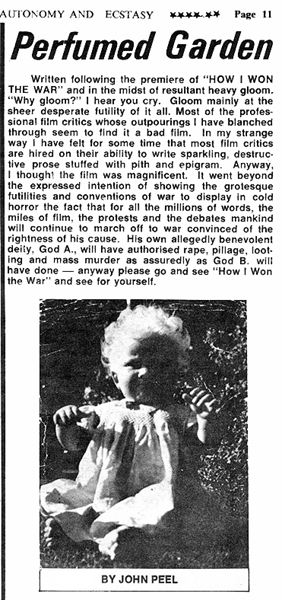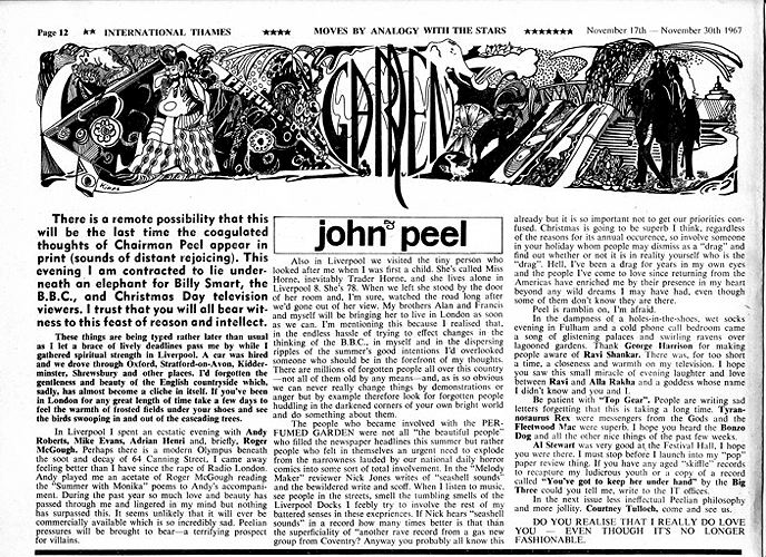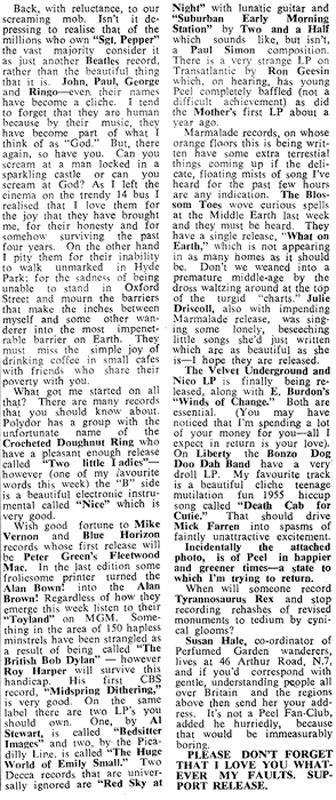 who says: "Peelie had his own column in the underground mag International Times. I'm lucky to have all the issues of this sometimes-irregularly-appearing publication." (click on pictures to read larger versions) |
