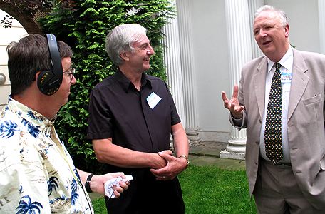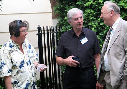 ...An enlargement reveals that it's a Britain Radio/Radio England car sticker, and Grey Pierson confesses to being the youthful culprit! He says that a newspaper took a photo of the offending sticker and used it to illustrate to its readers what an evil bunch of vandals were running the offshore stations and how they were corrupting the country's youth by defacing mock Greek temples with car stickers! We therefore felt it was appropriate to use that Greek archway as a header for a montage of photos of Grey's 40th anniversary reunion. Grey had arranged with the present occupants of #32 Curzon Street for a party of reunion guests to pay a nostaligic visit.