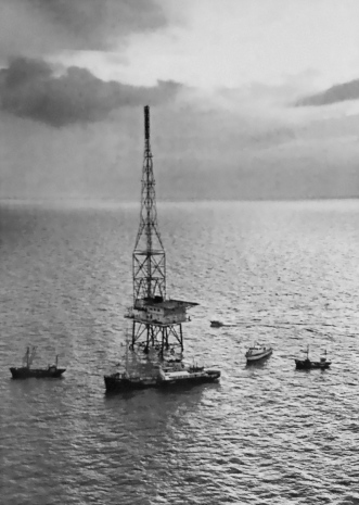 Once in situ the hollow legs were filled with concrete, before assembling a two story 40' x 80' cabin top most during the early summer of 1964