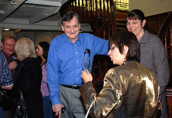 Chris introduces our guests. l to r Bud Ballou, Ian Damon, Ben, Mitch, Chris, Mary and Knees Club Official Jenny |