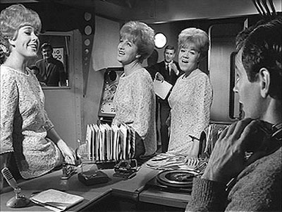 Tribute by Mary Payne – Page 2Although the RL website had been running since 1999 and several people had asked us about contacting Philip, we did not actually manage to get in touch with him via email till 2004. I received a message from Catherine McDonald in Alberta, Canada. Catherine (who sadly passed away in 2009) was a second cousin of Philip's, and hoped I could help her to contact him. She recalled Philip turning up in a Rolls Royce at her family home in Orpington when she was aged around 11 years old. He took her dad, Doug, to Biggin Hill for a flight in a Cessna which he piloted himself. Catherine was very jealous of this and was disappointed that Big L closed down before she and her brother Keith had been able to take advantage of Philip's promised trip out to the Galaxy. I was pleased to be able to pass Catherine's email on to Philip and they were delighted to be reunited. In recent years, I was also able to put Catherine's brother Keith in touch with Philip. Not everyone realises that Philip was a film star - if a background shot in 'Dateline Diamonds' – a pretty bad 'B' movie – counts as being a star. Ben Toney relates: "Philip Birch and I were credited as Technical Advisors to the film and had a couple of walk-on shots. One scene was quite laughable. They showed Philip and me inside the studio grooving to the song being performed by the Chantelles. Then they cut away to the main deck of the ship, and there I was again. I was in two places at the same time! At the first screening of the film, I called Harold Shampan's attention to this odd situation. He just laughed and said, 'Never mind, Ben, we'll just pretend you had a twin brother.'"