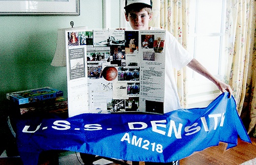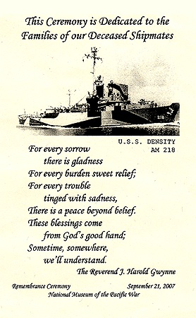 Mary and Chris, A very belated thank you note for all your kindness during the reunion in San Antonio. The time you both took with my mother, Gibson and me was very much appreciated. We had a fantastic time reconnecting with the Density Family and Gibson was truly touched by all the lovely memories of his grandfather. We were all so moved by the very special presentation of the ship's bell to the Pacific War Museum and are so grateful to be included in this once-in-a-lifetime experience. I am enclosing a photo of Gibson with his 'story board' - a collage of photos and mementoes from the reunion. We presented them in front of his Fifth Grade class when he returned to school. His teachers were amazed by this experience. The USS Density reunion was a 'living color' history lesson, but more importantly, it was a reminder to stay in touch with wonderful people who have touched your life meaningfully. Fondly, Eliza and Gibson Cushman, Hope Smith |