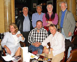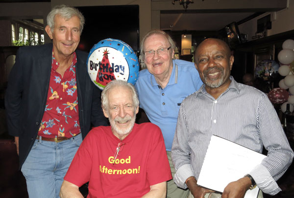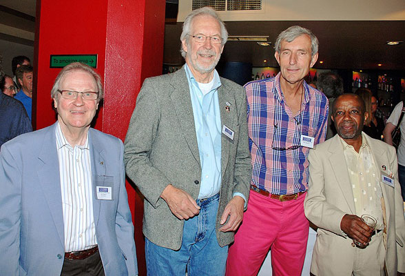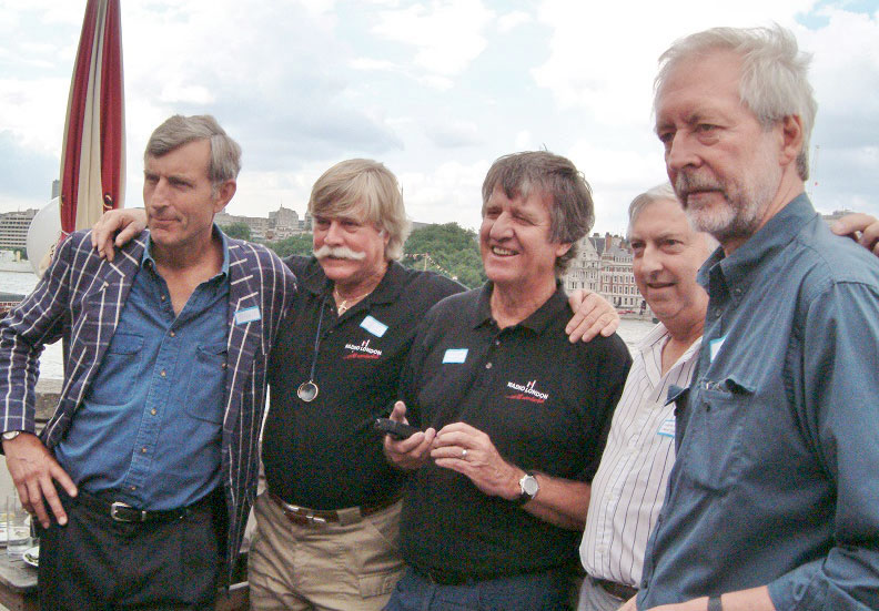 David Hawkins, Willy Walker, Ed Stewart and Keith Skues with Duncan at the Doggett's Reunion, London, 2002 |