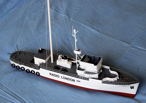 My model was converted from a plastic kit of an Admirable class minesweeper that I bought from America last year. It's a slightly later version than the USS Density AM218, but this was the only kit available. Fortunately, it was still suitable for the conversion. The ship is 17.5" long (44.4cm) x 3.25" wide (82.5cm) and 22.25" (56.5cm) from the bottom of the keel to the top of the aerial. Although it is difficult to see in the photos, the ship does have 'GALAXY' painted in small letters either side of the bow and on the stern. I decided not to put any rust on the Galaxy, as I wanted her to be as she was when first moored off the Essex coast, ready to broadcast as Radio London. The first and last words of her transmissions were spoken by DJ Paul Kay. |