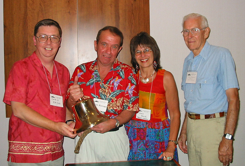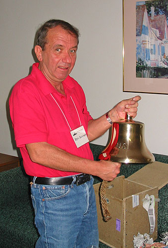 Our friendship with Ron began with an unexpected email received from him on January 29th 2002, a Sunday evening. Ron, the son of the MV Galaxy's beloved captain Bill, had discovered the Radio London website while surfing the net and he contacted us with the incredible news that he had the ship's bell in his possession. The bell dated from the time of the ship's first incarnation as a WW2 minesweeper named USS Density AM 218. As the son of a ship's captain who had also been a WW2 veteran, Ron understood exactly what the bell would mean to the shipmates who had served aboard 'The Mighty Little D' during the siege of Pearl Harbour and he was determined to return this precious artefact to them. Ron travelled to Branson, Missouri in September 2003 to present the bell to the shipmates at their 2003 reunion.