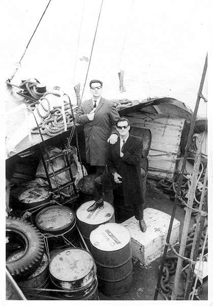 An exciting moment came when I had left the hand line over the stern, late in the evening. It had got dark, so I thought I'd pull in the line then go to bed. When I went to reel it in, I thought it was caught on something on the sea bed, so I asked John to give me a hand to get it up. "No," he said, "It's a fish". It took a long time to reel it in and when it came to the top I thought it was a sting ray, but it turned out to be a large skate. John had to hang over the stern while I grabbed his trousers with one hand and the line with the other, then he hooked the fish and brought it to the deck. The Captain said skate tasted nice and if I put it in the freezer cabinet, I could take it home when I went ashore.
