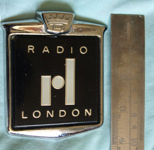In June 2010, Radio London webmasters Mary and Chris purchased this very attractive chrome-and-enamel Big L car badge from a private seller. Unfortunately, the artefact's owner was unable to tell us anything about it or where and when it had been acquired. The Radio London badge has no marks or serial numbers on the back. The enamelled design itself is protected by some sort of resin coating.