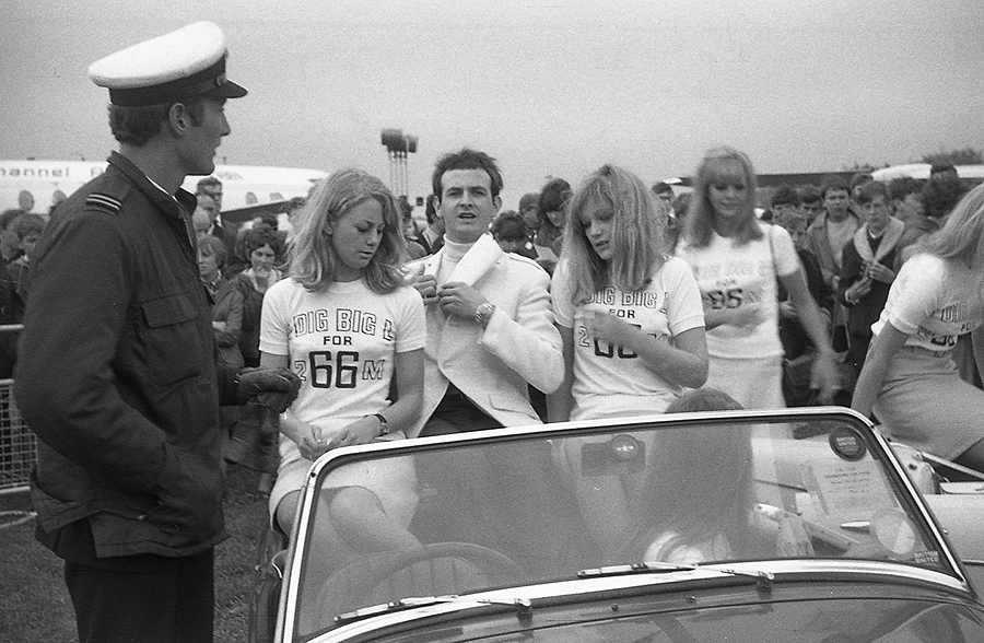 Brian Long, in his book 'The London Sound', reports that Mark Roman arrived by helicopter on Saturday 14th, to compere the 12.45 show of Berkertex's latest trendsetters. Mark, wearing a light suit instead of his trademark toga, was accompanied by six 'Big L Girls' from a West End club, wearing the 1966 design Radio London teeshirt. The girls' main purpose for being there appears to have been decorative.