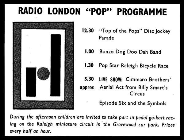 "As you say, not quite the right clothes for a bike race. It was meant to have been Kenny (in the race), but he ducked out, so it was left to me to fill the gap. It does look a little strange, but that was Big L for you!" Bands on the bill were the Bonzo Dog Doo Dah Band, Episode Six and the Symbols. Quite what a circus aerial act had in common with a Radio London pop event, we don't know, apart from the word 'aerial'! (Clipping from Mark Roman's archive.)