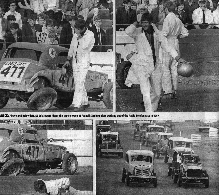 By July 16th 1967, Tony Blackburn had officially left Radio London, but like many other former Big L DJs, he continued to make personal onshore appearances on behalf of the station. He competed with Marshall Mike Lennox, Cardboard Shoes and Stewpot, in a 'Stars Race' at the Ipswich Stadium Spedeworth Stock Car meeting. Stewpot's race ended badly, as shown by the photos above. 'Star' competition was provided by Jeff Beck, John Walker and other celebs of the day, but Tony was the winner! Newspaper clippings from the Ipswich Star, June 26 2007, courtesy of Brian Nichols of the Felixstowe and Offshore Radio Facebook Page |