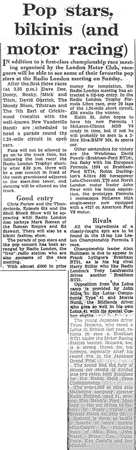 Needless to say, the motor racing fraternity was unimpressed by the appearances of such hoi polloi as radio deejays, pop stars and the shenanigans of their fans at a race meeting and scathing reports ensued in the motoring magazines. However, as the Brands Hatch attendance figures doubled that day, more Radio London events were to follow.