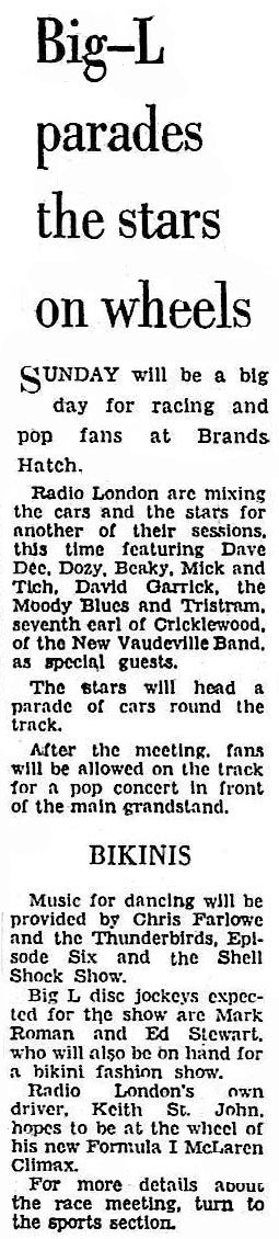 The Chatham Standard advertisement, (left) which strangely features a photo of a racing Minis which has no relevance to the Radio London meeting, covers all bases by adding the words 'last-minute surprises' to the guest list. However, the advert also guest lists Cream. Was this a mistake? This is the only indication anywhere, that Cream were slated to be Radio London guests at Brands Hatch, although 'Strange Brew' was up to #4 on the a Fab Forty on the day of the race meeting.