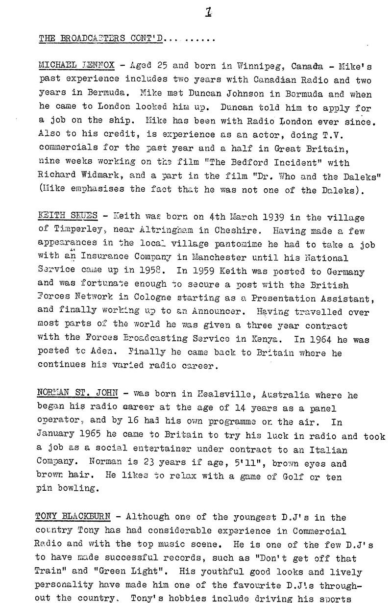 The inclusion of Norm St John on the DJ list assists us in dating the document to in or after July '66, when Norm joined the station. Unfortunately, Tony Blackburn has fallen off the bottom of the page. |