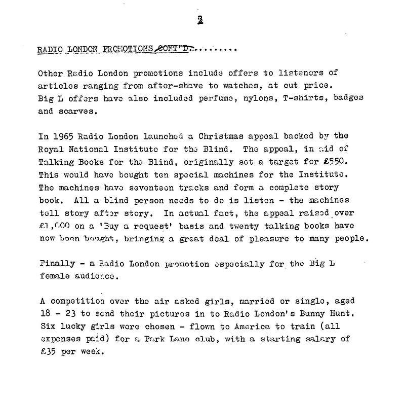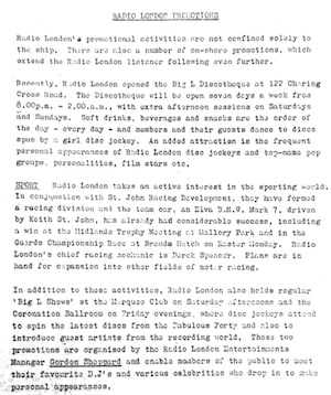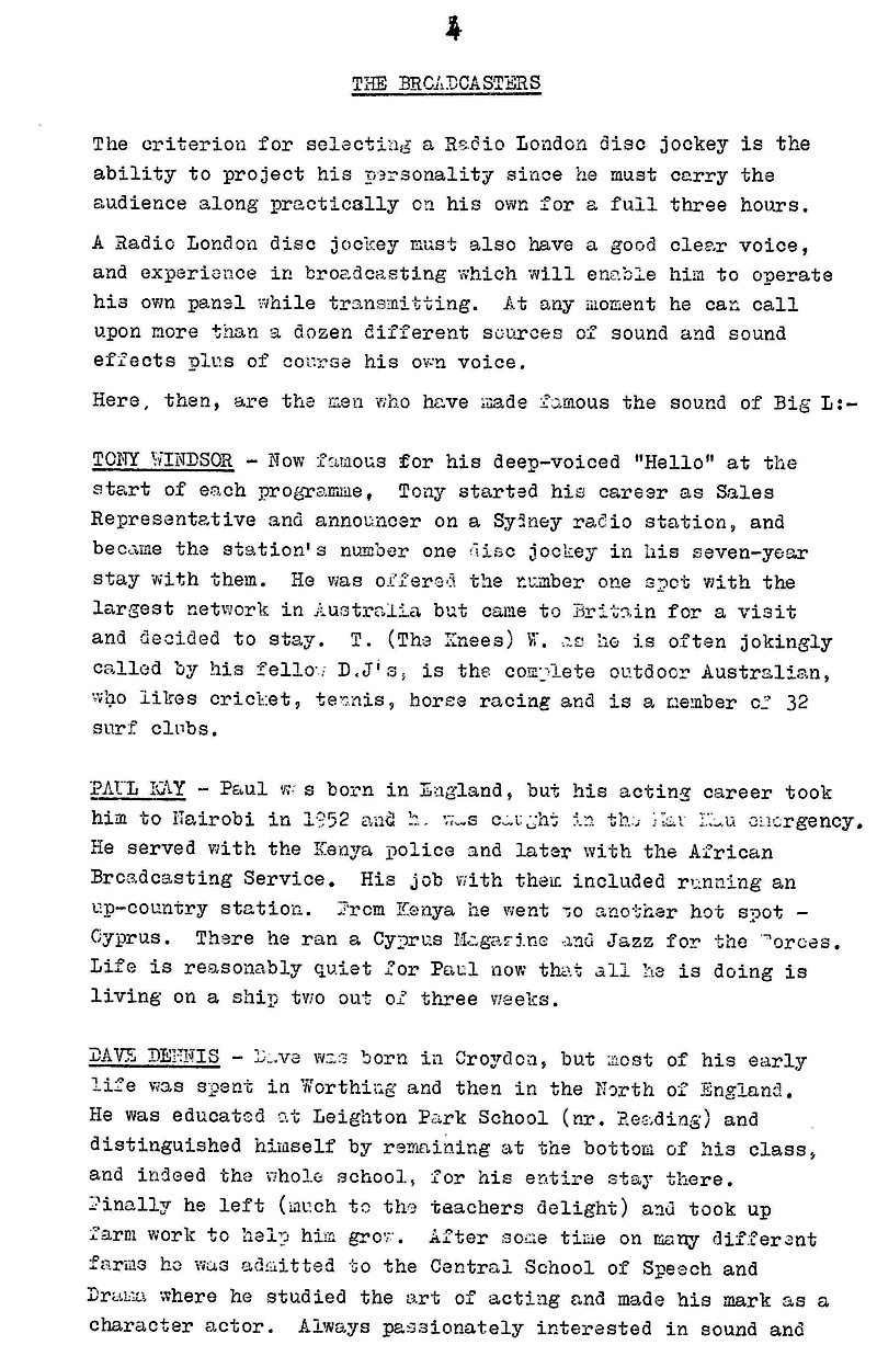 The Programme Controller's name is omitted. When Ben Toney left, his place was taken by Senior Sales Executive Alan Keen. In this lengthy explanation of 'Formula Radio' (surely Top Forty FORMAT radio?) there is nothing about Climbers, which were, of course, an essential part of the weekly playlist, nor is there any reference to the PAMS jingles that were as much a of the station's identity and personality as the DJs. I do not recall The Radio London Club ever being referred to as The Big L fan club. |