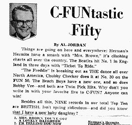 The Animals are up to #5 but nobody can topple the Fab Four. Bring It on Home to Me added a harder, Eric Burdon edge to a Sam Cooke song. This week, Herman's Hermits bring another Cooke cover straight in at #28. (Sam Cooke had died in 1964.) The CD Best of the Animals contains this, and 19 other favourites, all with preview clips. For those who enjoy chart comparisons, below this week's Big L Fab 40, there is a copy of the C-FUNtastic Fifty, from Vancouver, BC. This is assumed to be the C-FUN chart for the week commencing 18th April, but as it is undated, it's possible it is from the week before. If anyone in Canada has any thoughts on the subject, please get in touch! |