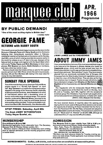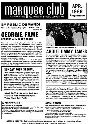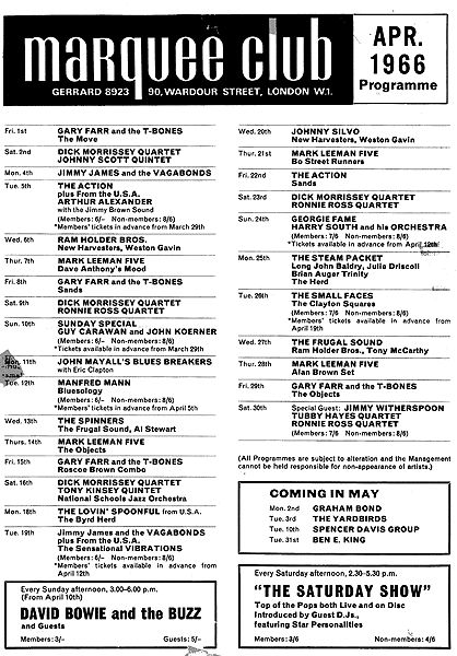 has its own page here. Fruit Eating Bears: ("Honestly!" as one reviewer of the time put it, referring to the strange name adopted by the Merseys' backing group). Kenny Goodlass (#197), Ken Mundye (#198), Kris Findlay (#199), George Cassidy (#200) and Joey Molland (#201). Click on either of the April 1966 Marquee schedules (right) to see a legible version. Note that the Radio London Club afternoon is listed merely as 'The Saturday Show', with no mention of Big L at all. |