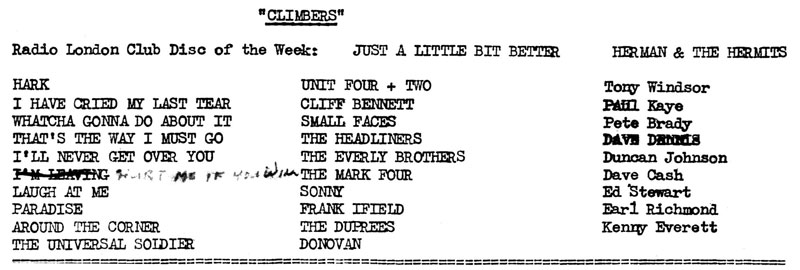 Dave Cash's climber was originally titled simply 'Hurt Me' on demo copies, but changed to Hurt Me if You Will on the single's release. However, it seems that according to the Curzon Street list, above, Radio London had been contemplating playing the B-side, I'm Leaving, a track reminiscent of early Rolling Stones material, with a Bo Diddly rhythm. This may have been simply a Radlon admin error, or possibly a change by Decca.