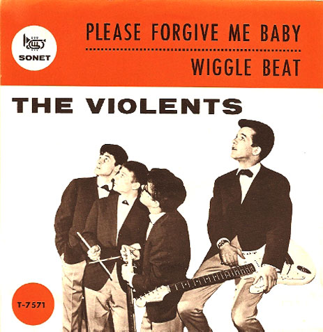 This somewhat familiar-looking photo, unearthed by Alan Field, depicts Swedish band The Violents (who did look remarkably non-violent when it was taken in 1963). If we flip the photo so that the band is facing the opposite way (below) and compare it side by side with another Violents picture sleeve, we can tell easily that it's two shots of the same band. |